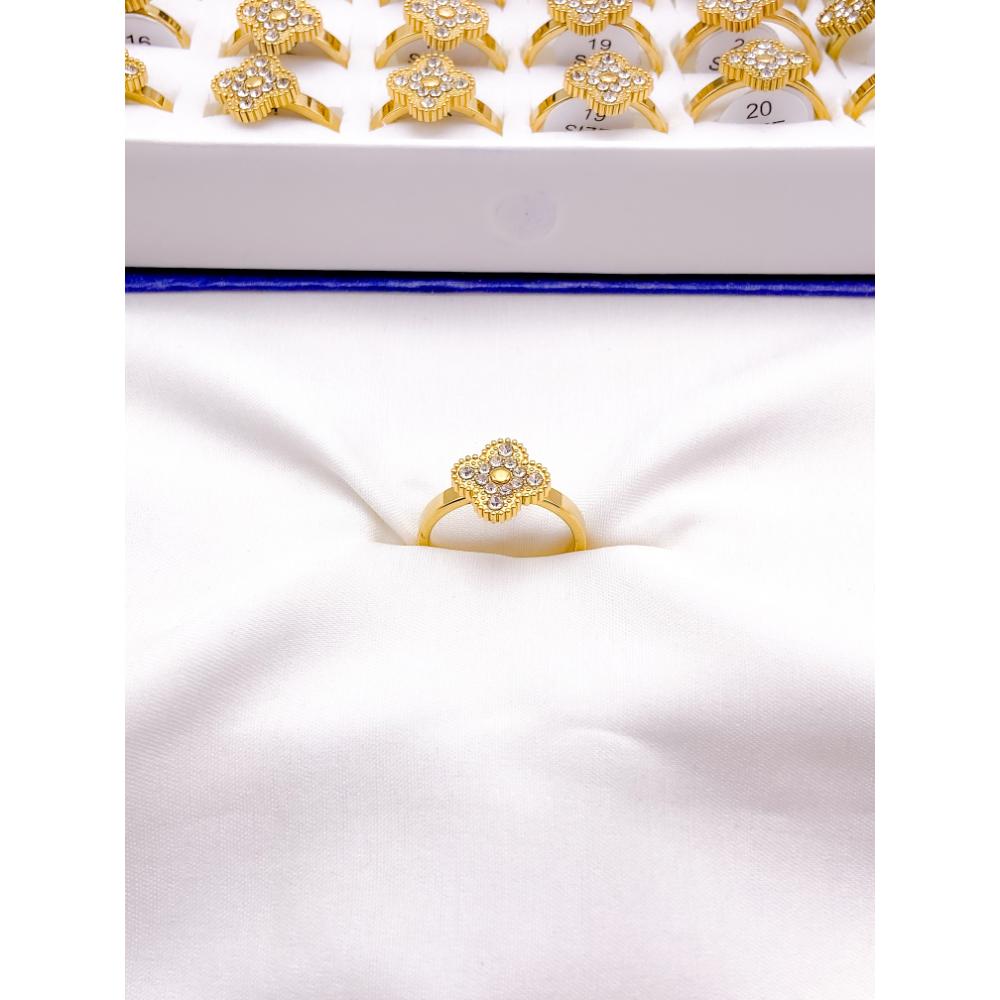 ANEL AÇO INOXIDÁVEL TREVO CRAVEJADO PEDRA CRISTAL - DOURADO
