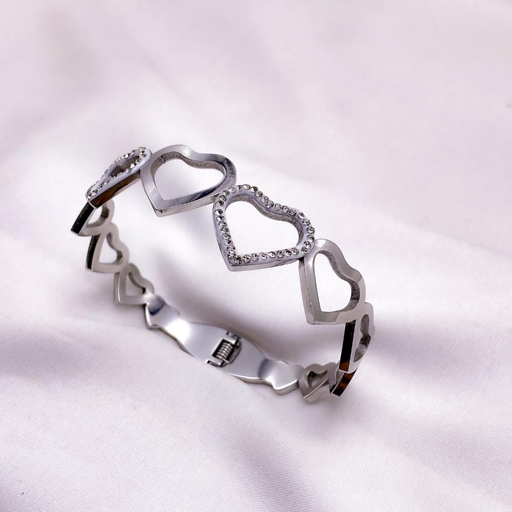 BRACELETE AÇO INOXIDÁVEL CORAÇÃO CRAVEJADO STRASS - PRATEADO