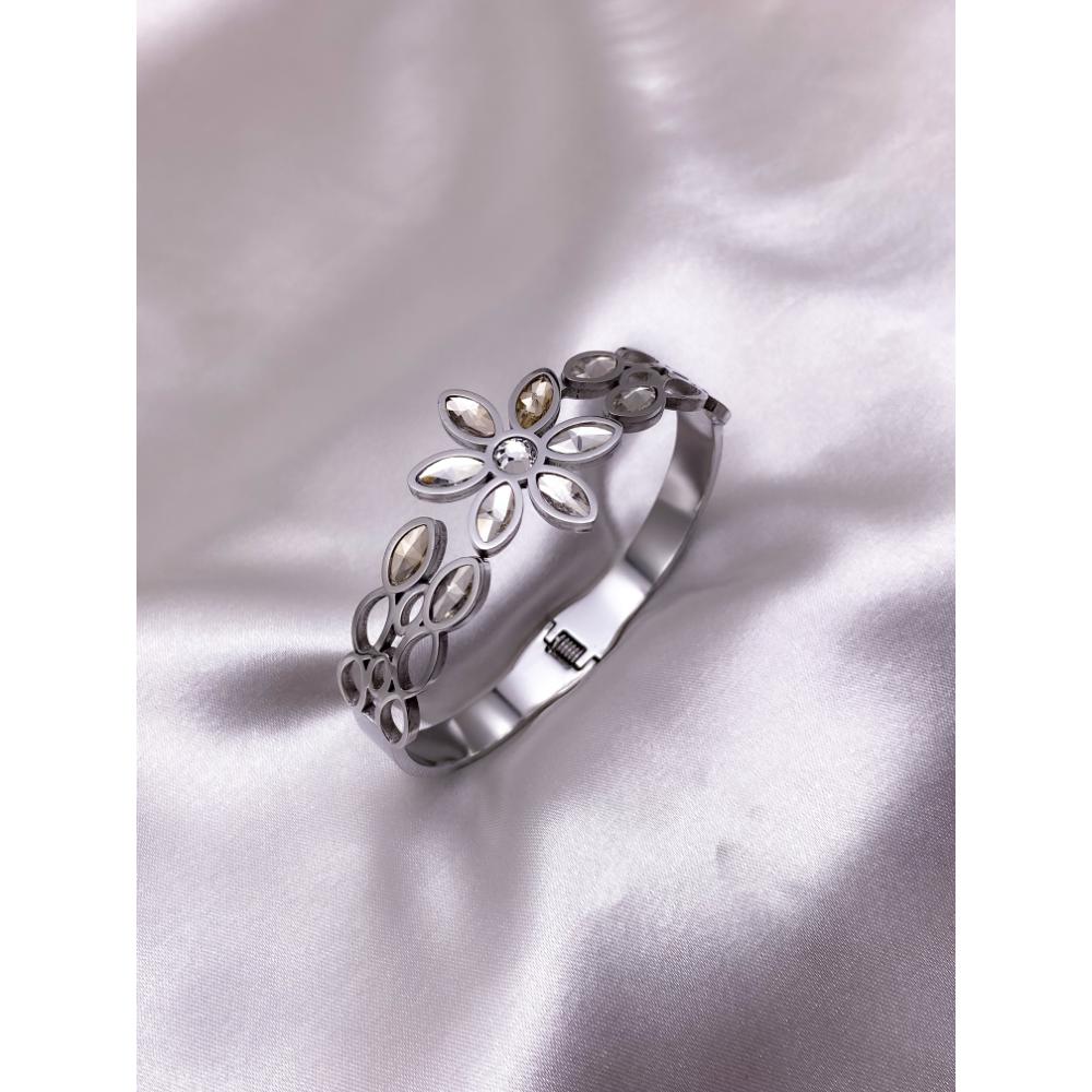 BRACELETE AÇO INOX FLOR PEDRA CRISTAL - PRATEADO