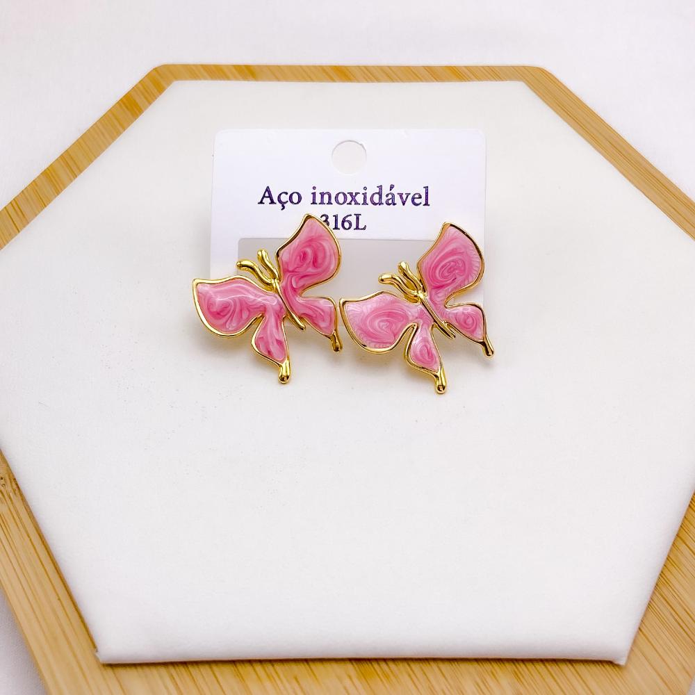 PRODUTO: BRINCO AÇO INOX BORBOLETA RESINADO DOURADO - ROSA