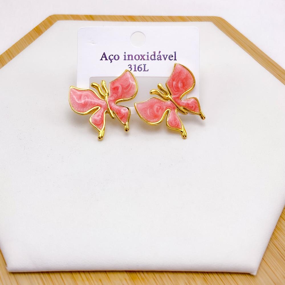 PRODUTO: BRINCO AÇO INOX BORBOLETA RESINADO DOURADO - VERMELHO