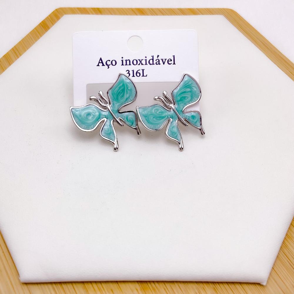 PRODUTO: BRINCO AÇO INOX BORBOLETA RESINADO VERDE - PRATEADO