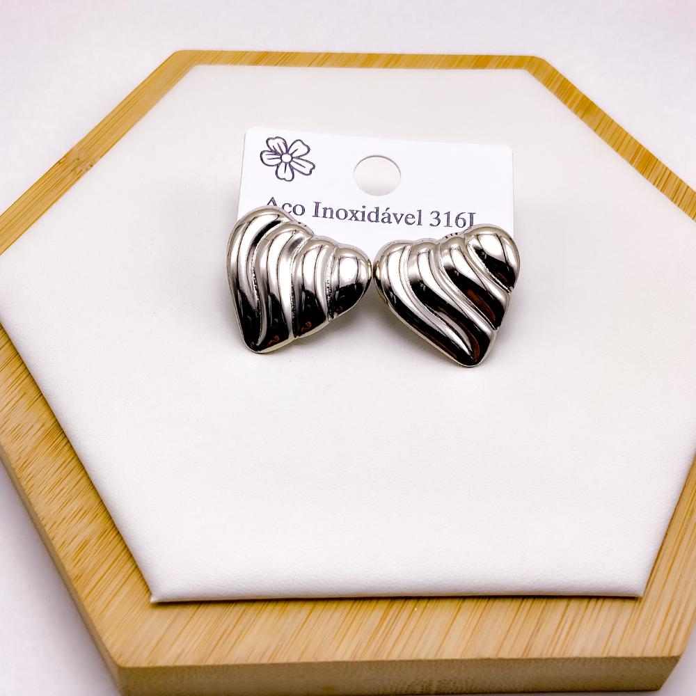 PRODUTO: BRINCO AÇO INOX  CORAÇÃO COM DETALHES - PRATEADO