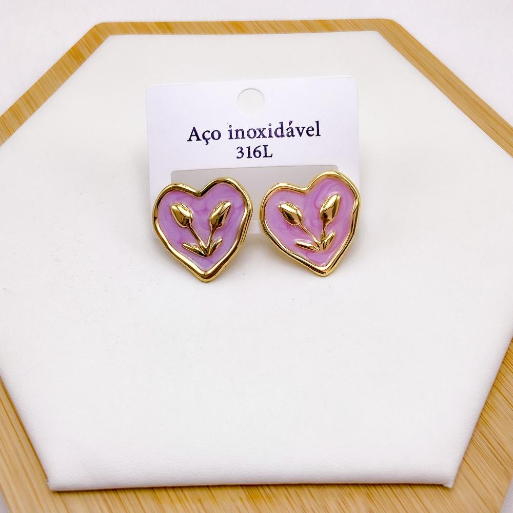 PRODUTO: BRINCO AÇO INOX CORAÇÃO RESINADO LILÁS - DOURADO