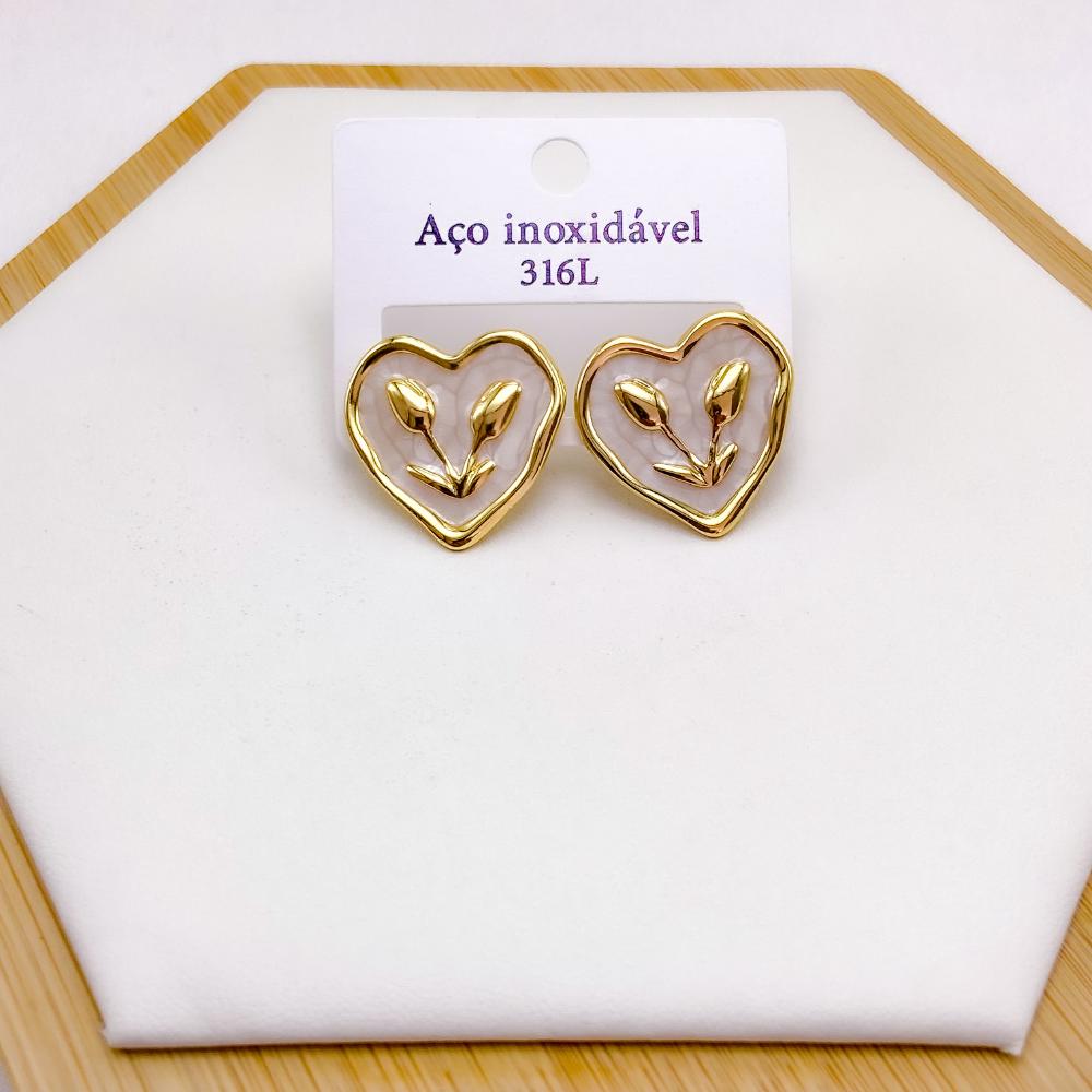 PRODUTO: BRINCO AÇO INOX CORAÇÃO RESINADO PEROLADO - DOURADO