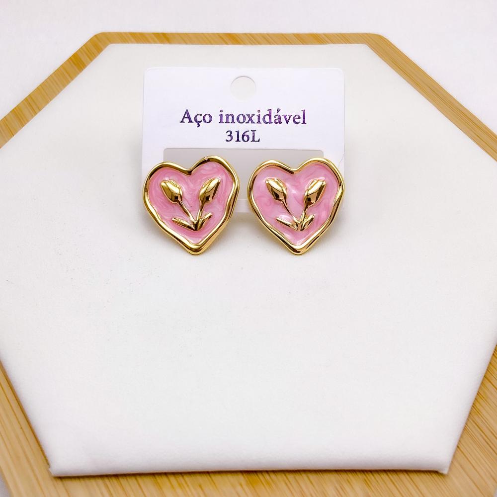 PRODUTO: BRINCO AÇO INOX CORAÇÃO RESINADO ROSA - DOURADO