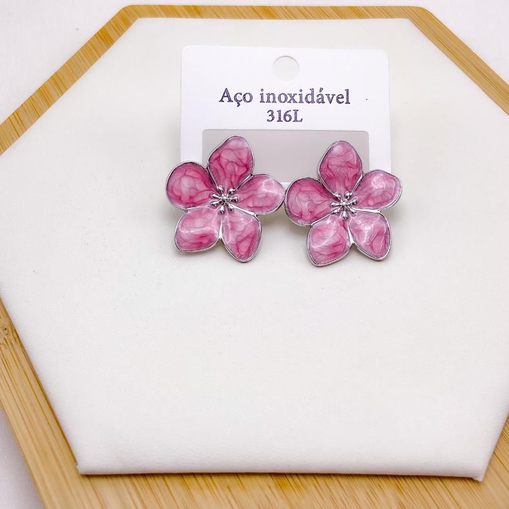 PRODUTO: BRINCO AÇO INOX CORAÇÃO RESINADO ROSA  - PRATEADO