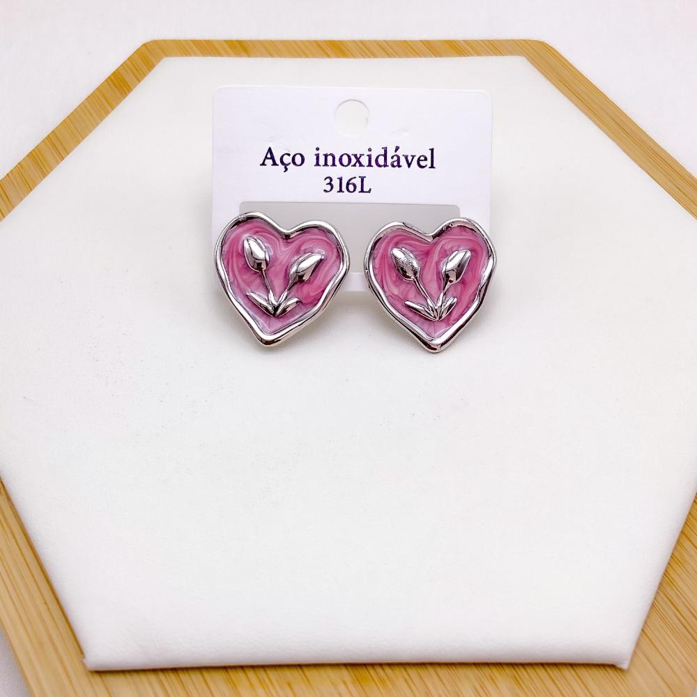 PRODUTO: BRINCO AÇO INOX CORAÇÃO RESINADO ROSA - PRATEADO