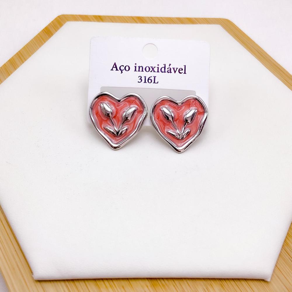 PRODUTO: BRINCO AÇO INOX CORAÇÃO RESINADO VERMELHO - PRATEADO