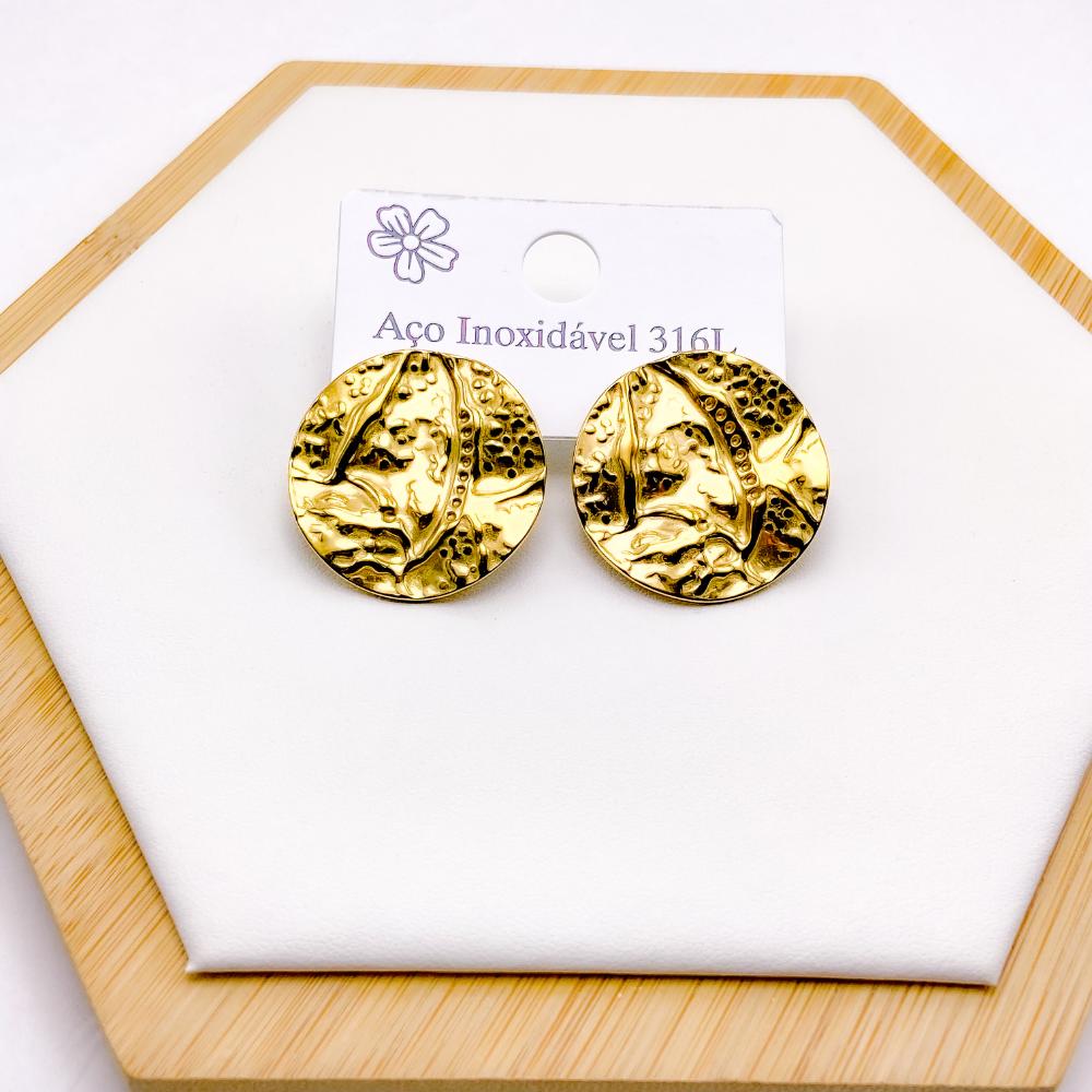 PRODUTO: BRINCO AÇO INOX ESTILO BOTÃO COM DETALHES - DOURADO