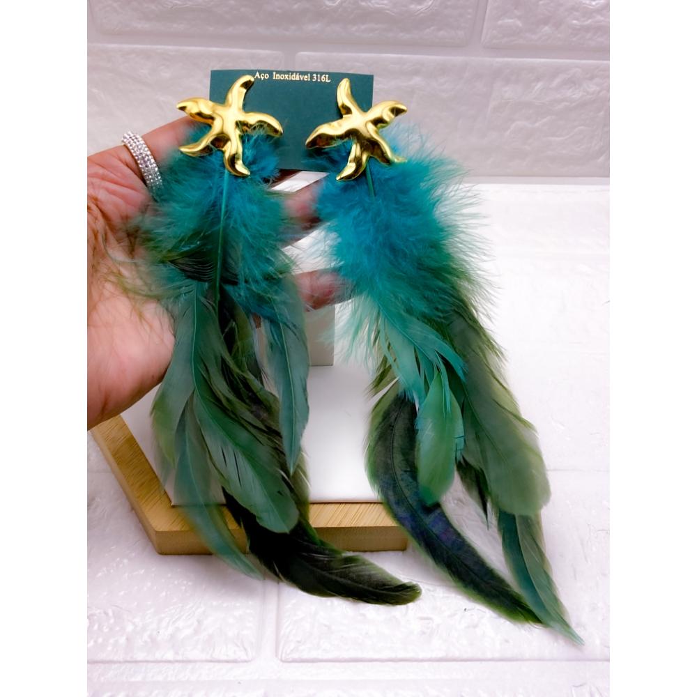 PRODUTO: BRINCO AÇO INOX ESTRELA DO MAR PENA AZUL - DOURADO