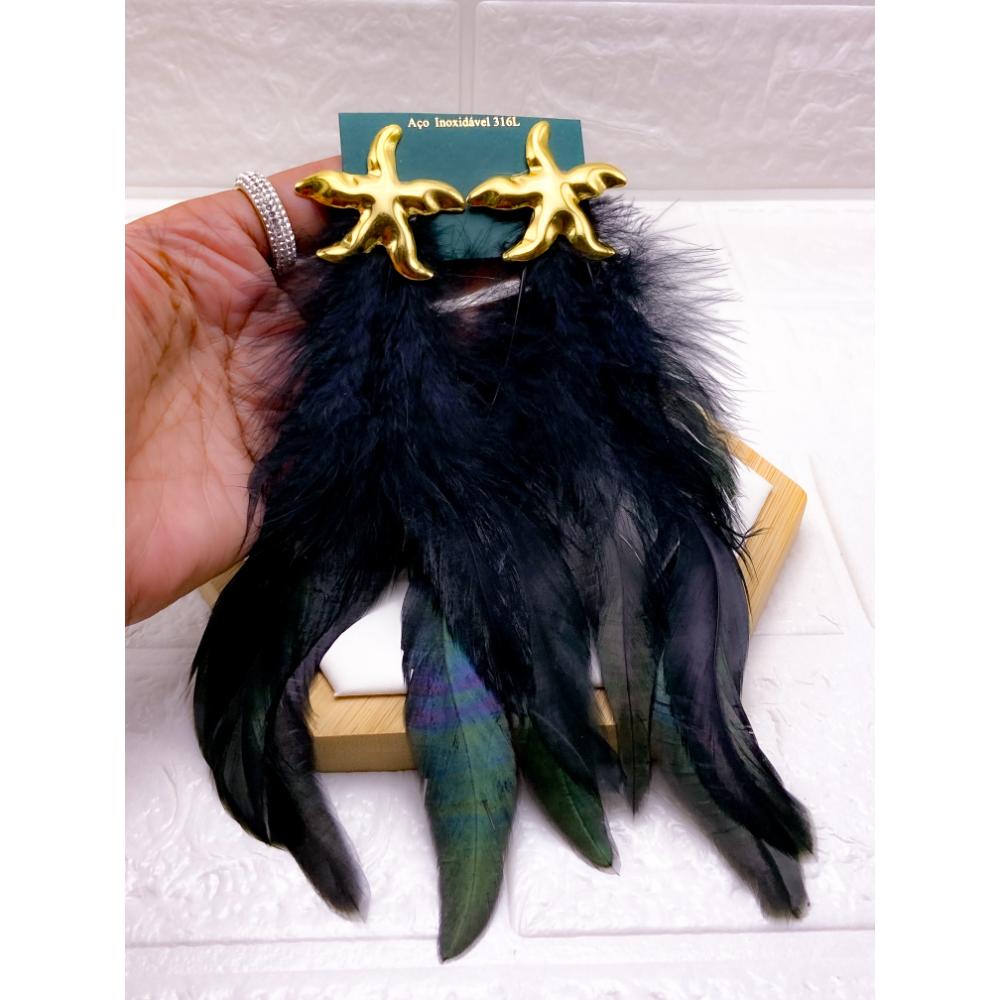 PRODUTO: BRINCO AÇO INOX ESTRELA DO MAR PENA PRETA- DOURADO