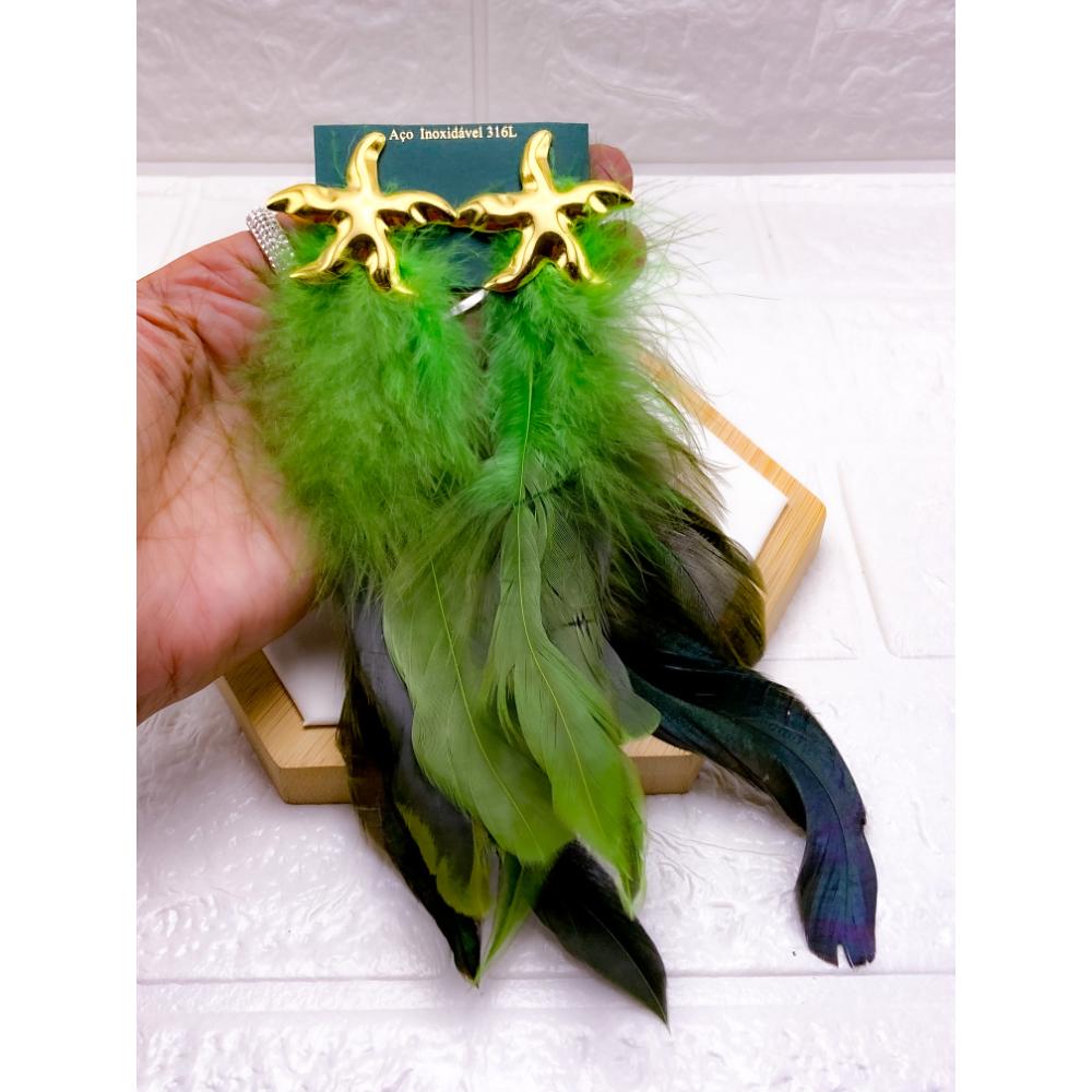PRODUTO: BRINCO AÇO INOX ESTRELA DO MAR PENA VERDE - DOURADO