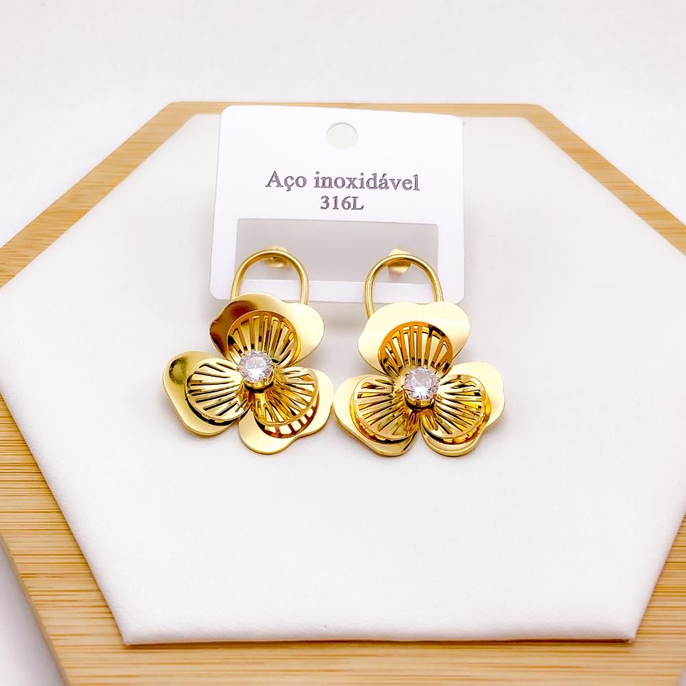 PRODUTO: BRINCO AÇO INOX  FLOR COM PEDRA CRISTAL - DOURADO