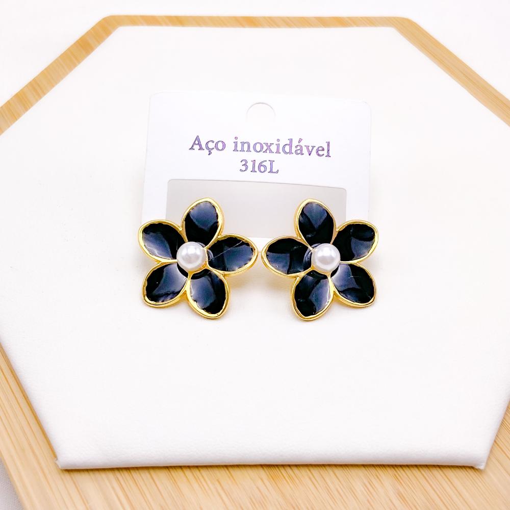 PRODUTO: BRINCO AÇO INOX FLOR PEROLA RESINADO DOURADO - PRETO