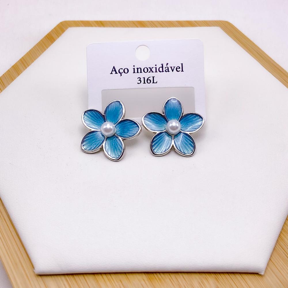 PRODUTO: BRINCO AÇO INOX FLOR PEROLA RESINADO PRATEADO - VERDE