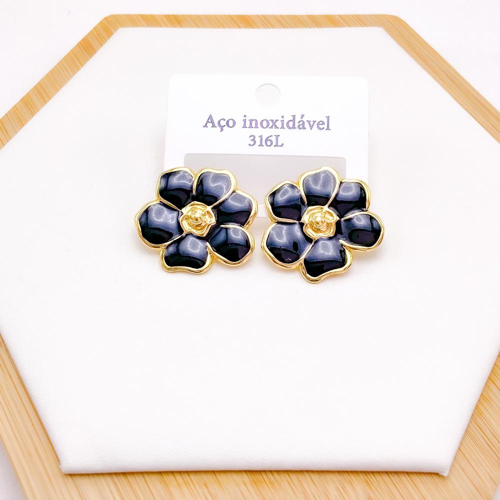 PRODUTO: BRINCO AÇO INOX FLOR RESINADO DOURADO - PRETO