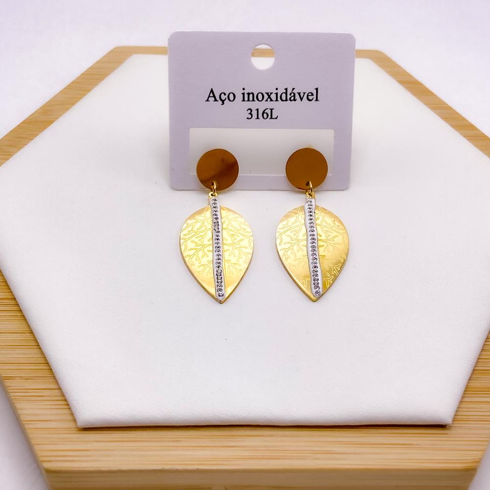 PRODUTO: BRINCO AÇO INOX FOLHA STRASS - DOURADO