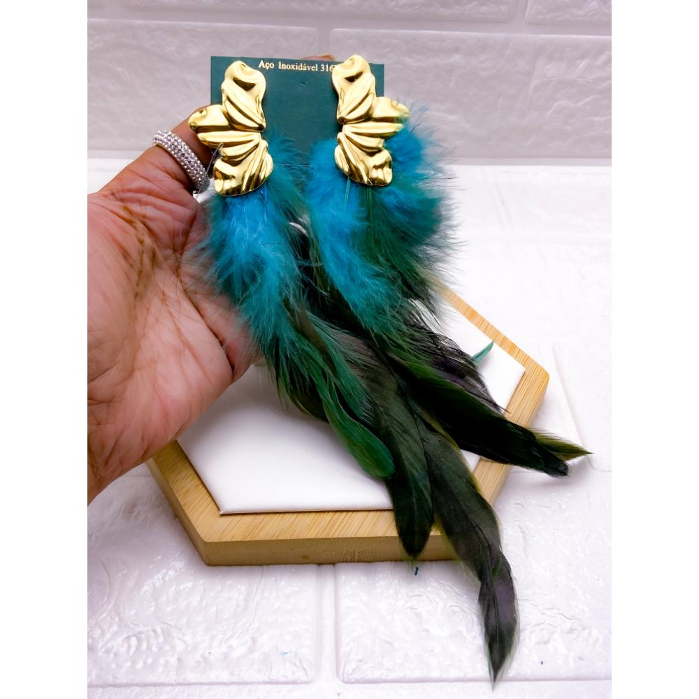 PRODUTO: BRINCO AÇO INOX MEIA FLOR PENA AZUL - DOURADO