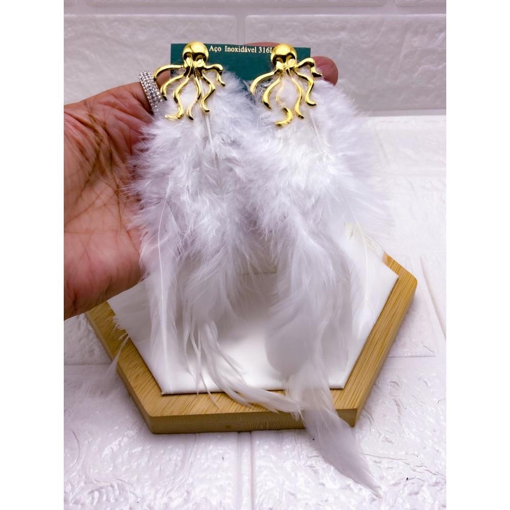 PRODUTO: BRINCO AÇO INOX POLVO PENA BRANCA - DOURADO