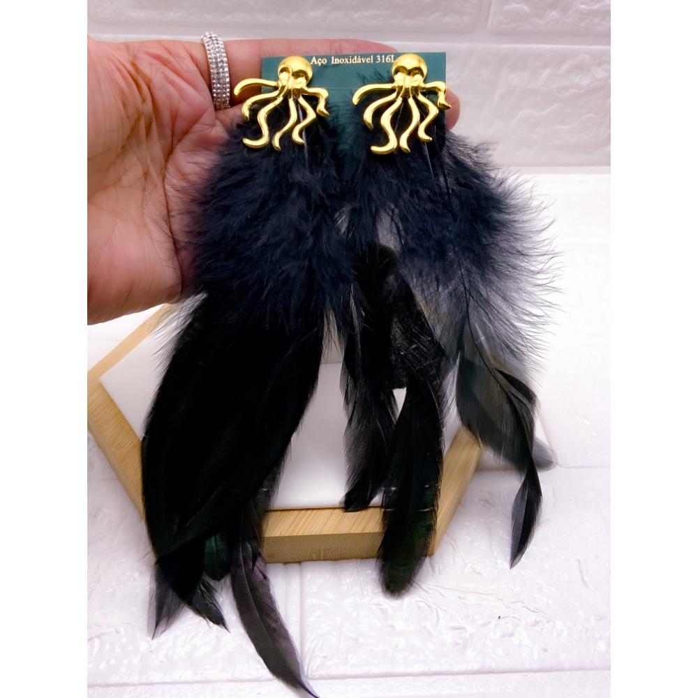 PRODUTO: BRINCO AÇO INOX POLVO PENA PRETA- DOURADO