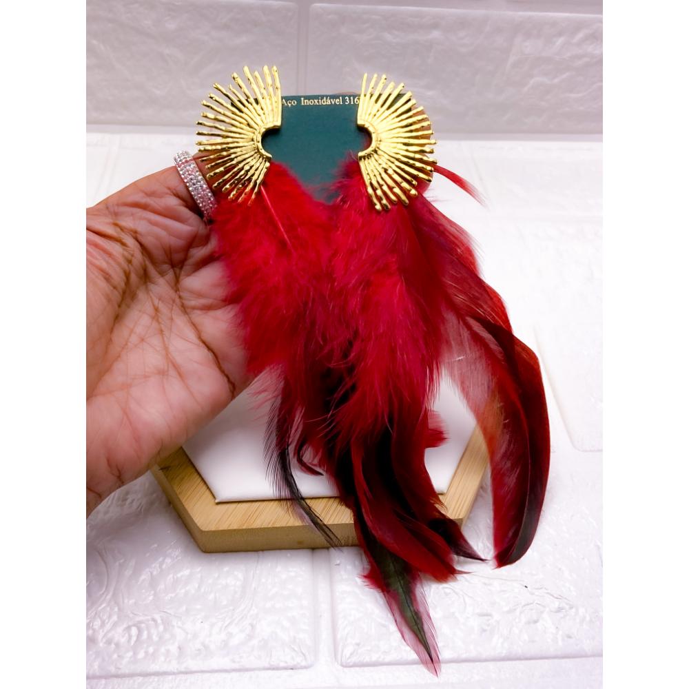 PRODUTO: BRINCO AÇO INOX RAIOS PENA VERMELHA- DOURADO