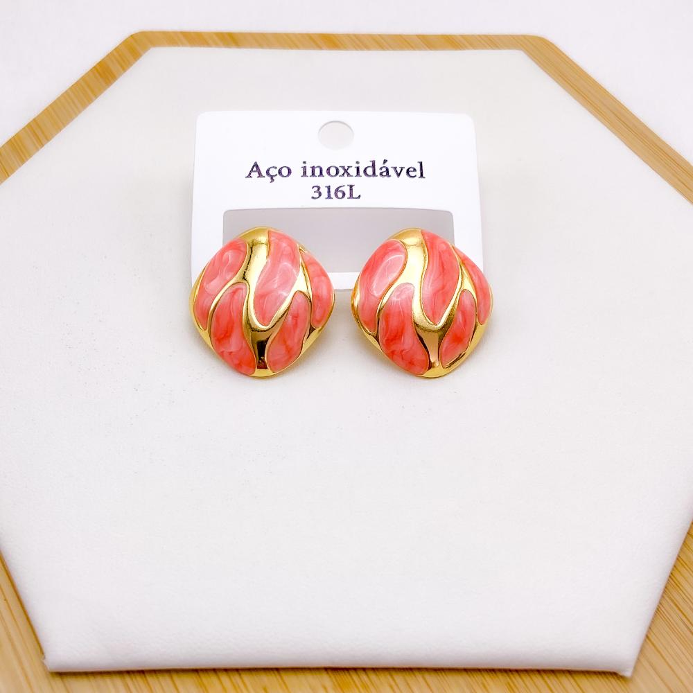 PRODUTO: BRINCO AÇO INOX REDONDO RESINADO DOURADO - VERMELHO