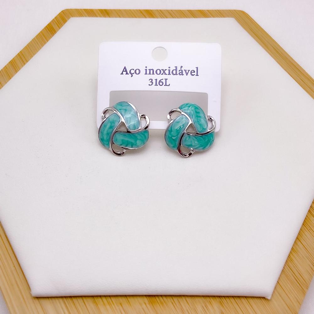 PRODUTO: BRINCO AÇO INOX REDONDO RESINADO PRATEADO - VERDE