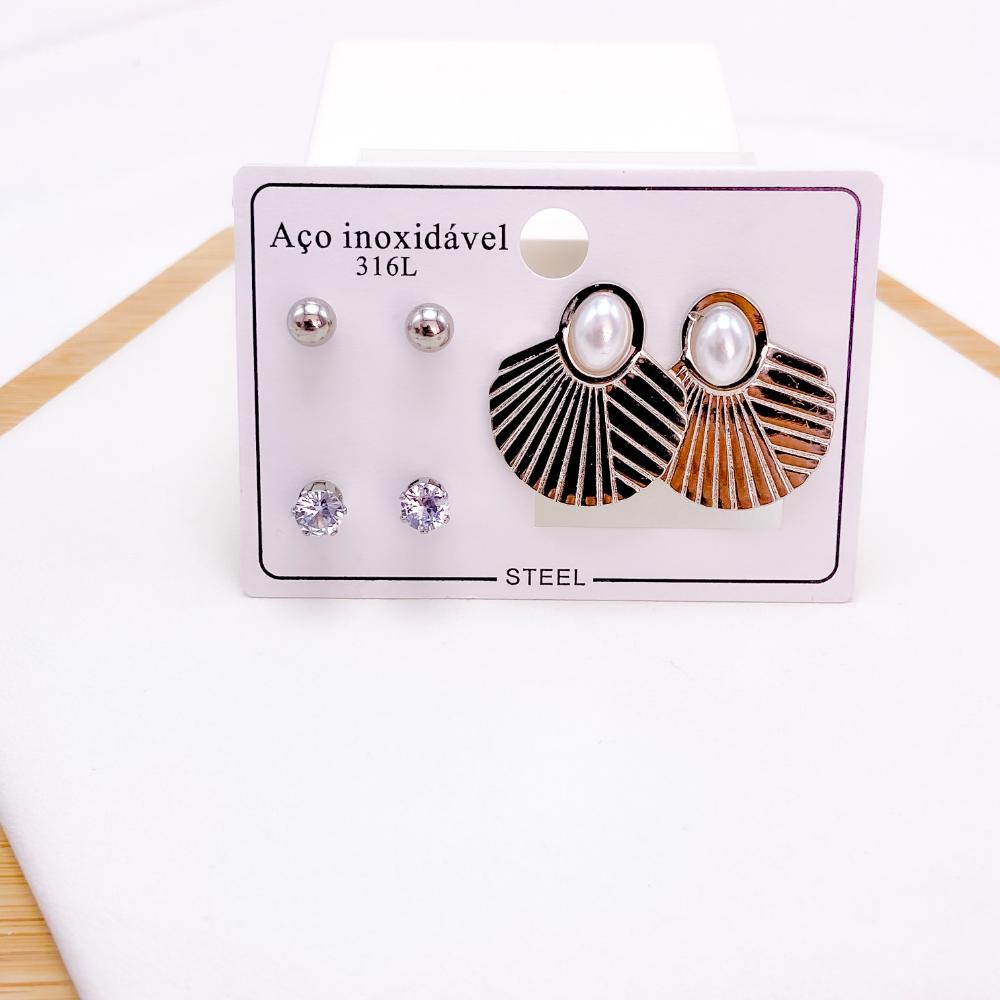 PRODUTO: CARTELA BRINCO TRIO AÇO INOX LEQUE COM PÉROLA - DOURADO