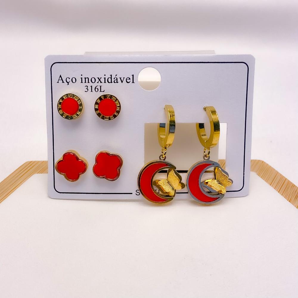 PRODUTO: CARTELA TRIO BRINCO AÇO INOXIDÁVEL ARGOLINHA CLICK MEIA LUA VERMELHA E BORBOLETA 3D - DOURADO