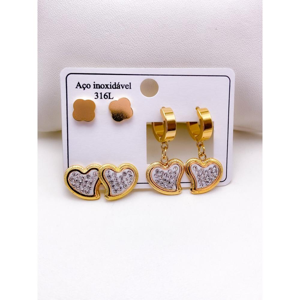 PRODUTO: CARTELA TRIO BRINCO AÇO INOX CORAÇÃO CRAVEJADO - DOURADO