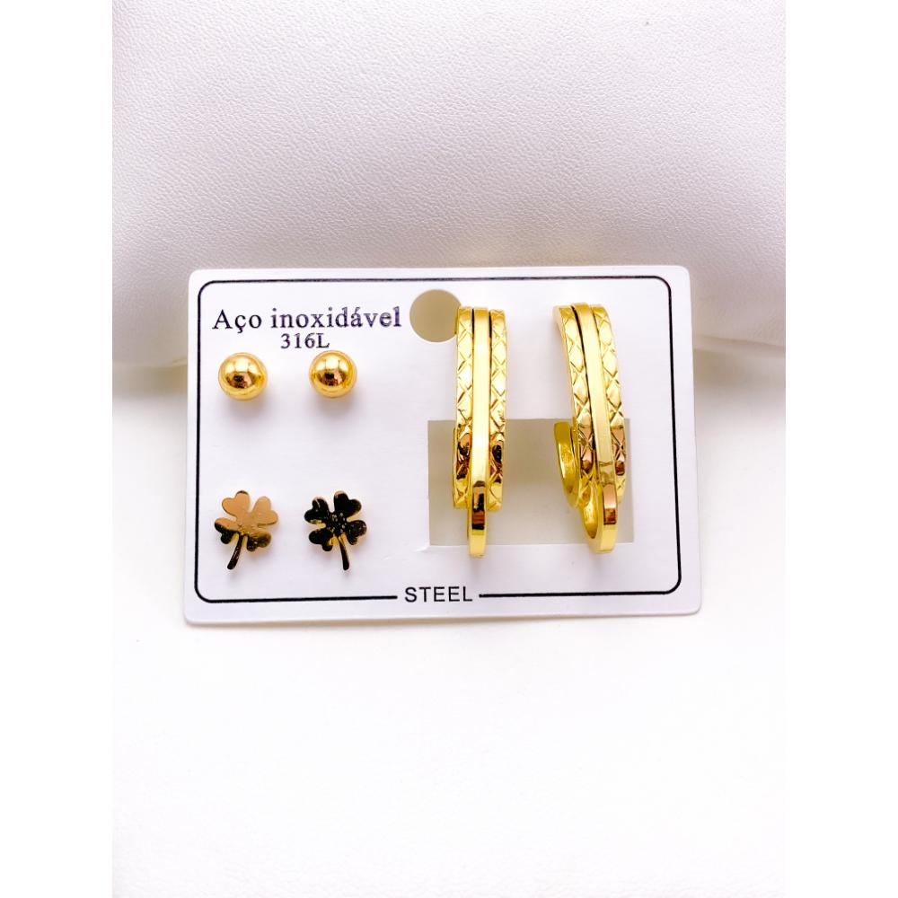 PRODUTO: CARTELA TRIO BRINCO AÇO INOX GEOMETRICO COM DETALHES - DOURADO
