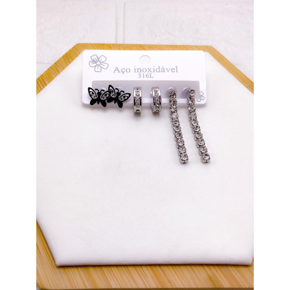 PRODUTO: CARTELA TRIO BRINCO AÇO INOX PEDRA CRISTAL BORBOLETA - PRATEADO