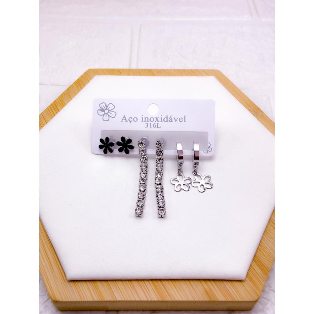 PRODUTO: CARTELA TRIO BRINCO AÇO INOX PEDRA CRISTAL FLOR - PRATEADO
