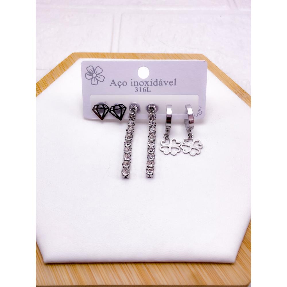 PRODUTO: CARTELA TRIO BRINCO AÇO INOX PEDRA CRISTAL TREVO- PRATEADO