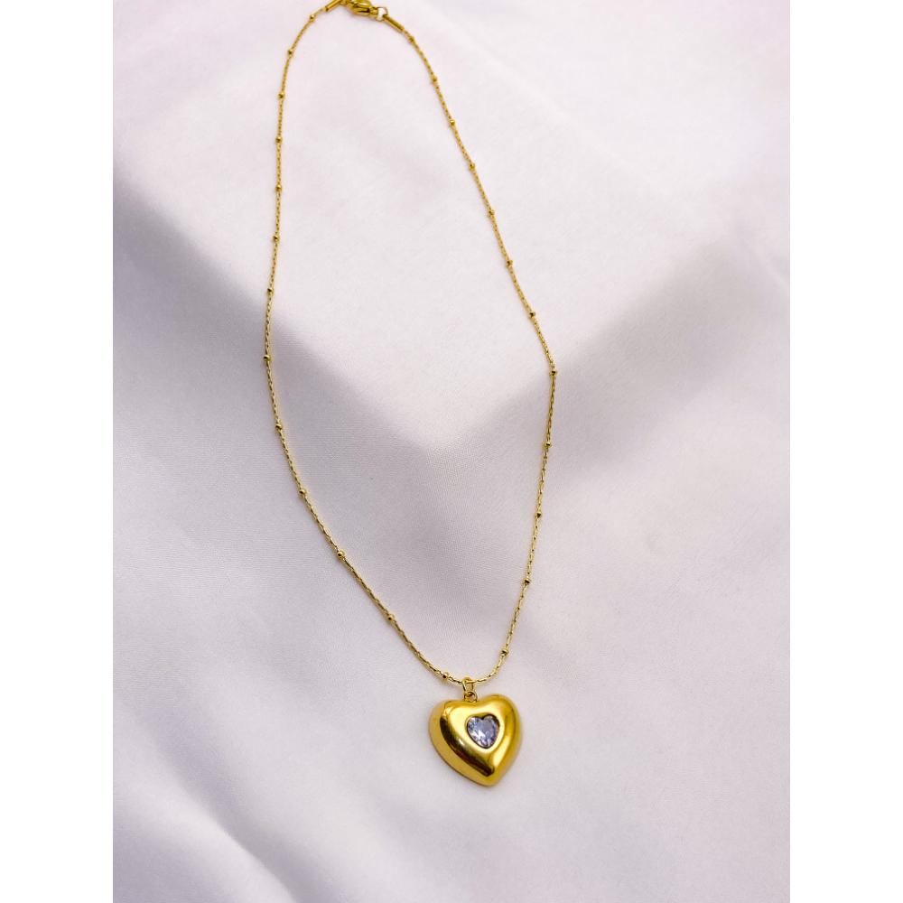 COLAR AÇO INOX 45CM MINI BOLINHAS PINGENTE CORAÇÃO PEDRA CRISTAL - DOURADO