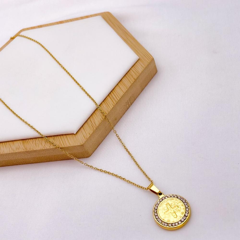 COLAR AÇO INOX 316L 45CM PINGENTE SÃO BENTO CRAVEJADO - DOURADO