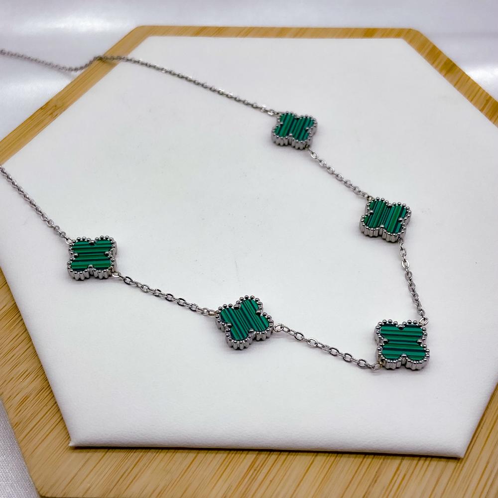 COLAR AÇO INOX 45 CM TREVO PRATEADO - VERDE