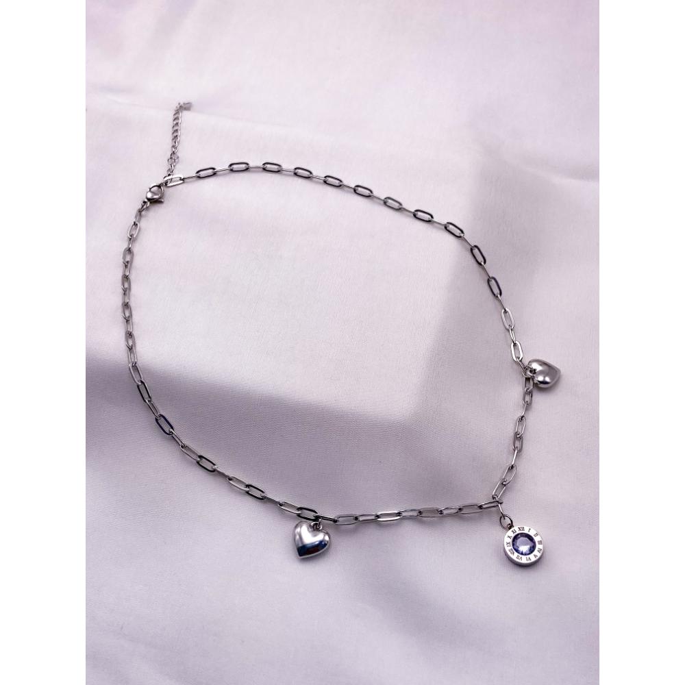 COLAR AÇO INOX 45CM CORRENTARIA PINGENTE ALGARISMO ROMANO PEDRA CRISTAL - PRATEADO