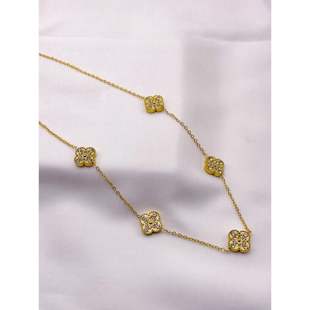 COLAR AÇO INOX 45CM TREVO CRAVEJADO PEDRAS CRISTAL - DOURADO