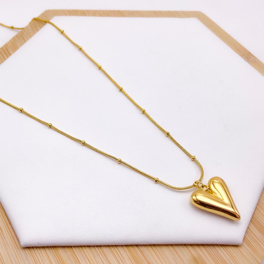 PRODUTO: COLAR AÇO INOXIDÁVEL 45CM BOLINHAS PINGENTE CORAÇÃO - DOURADO