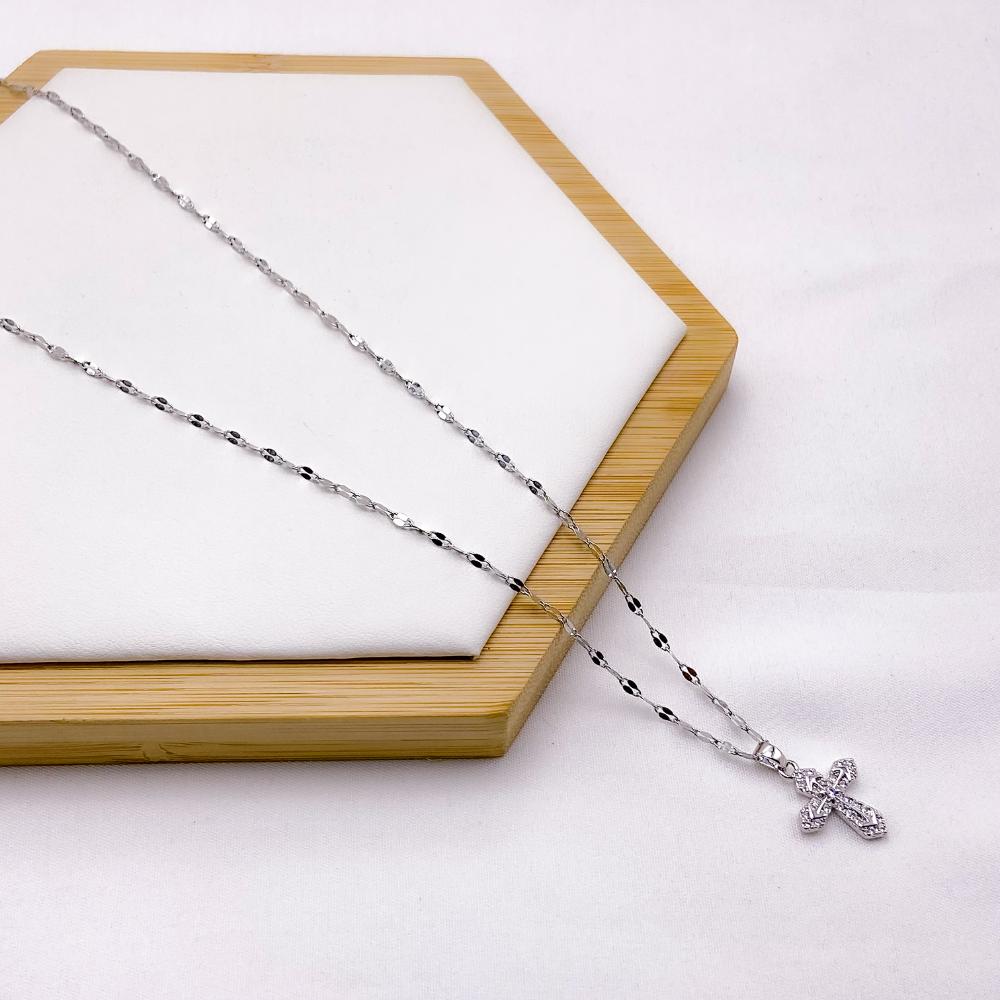 COLAR AÇO INOXIDÁVEL 45CM PINGENTE BANHADO CRUZ CRAVEJADO STRASS - PRATEADO
