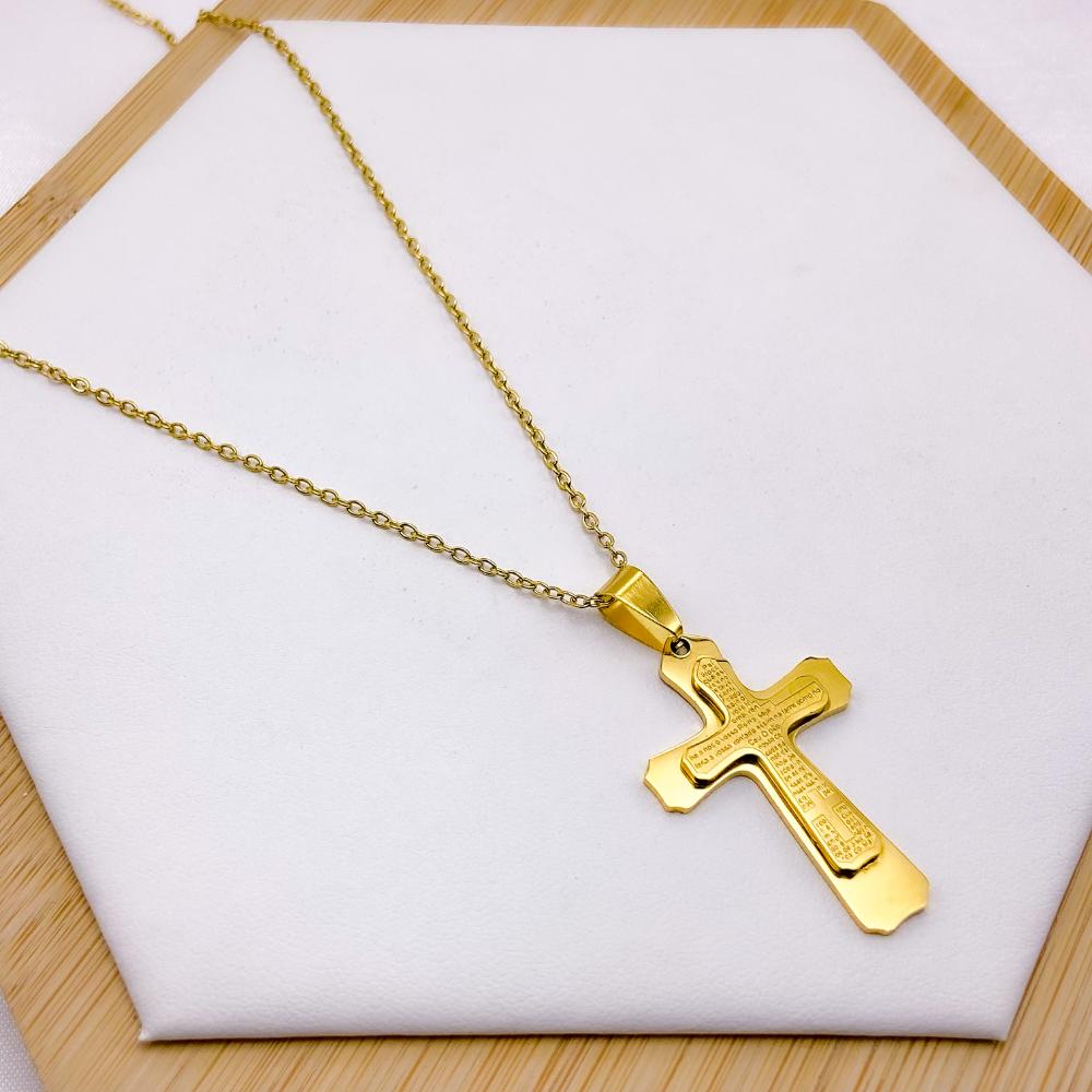 PRODUTO: COLAR AÇO INOXIDÁVEL 45CM PINGENTE CRUCIFIXO 3D ORAÇÃO PAI NOSSO - DOURADO
