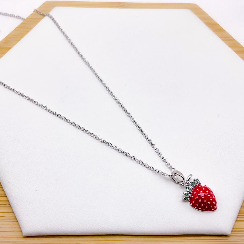 PRODUTO: COLAR AÇO INOXIDÁVEL 45CM PINGENTE MORANGO VERMELHO - PRATEADO