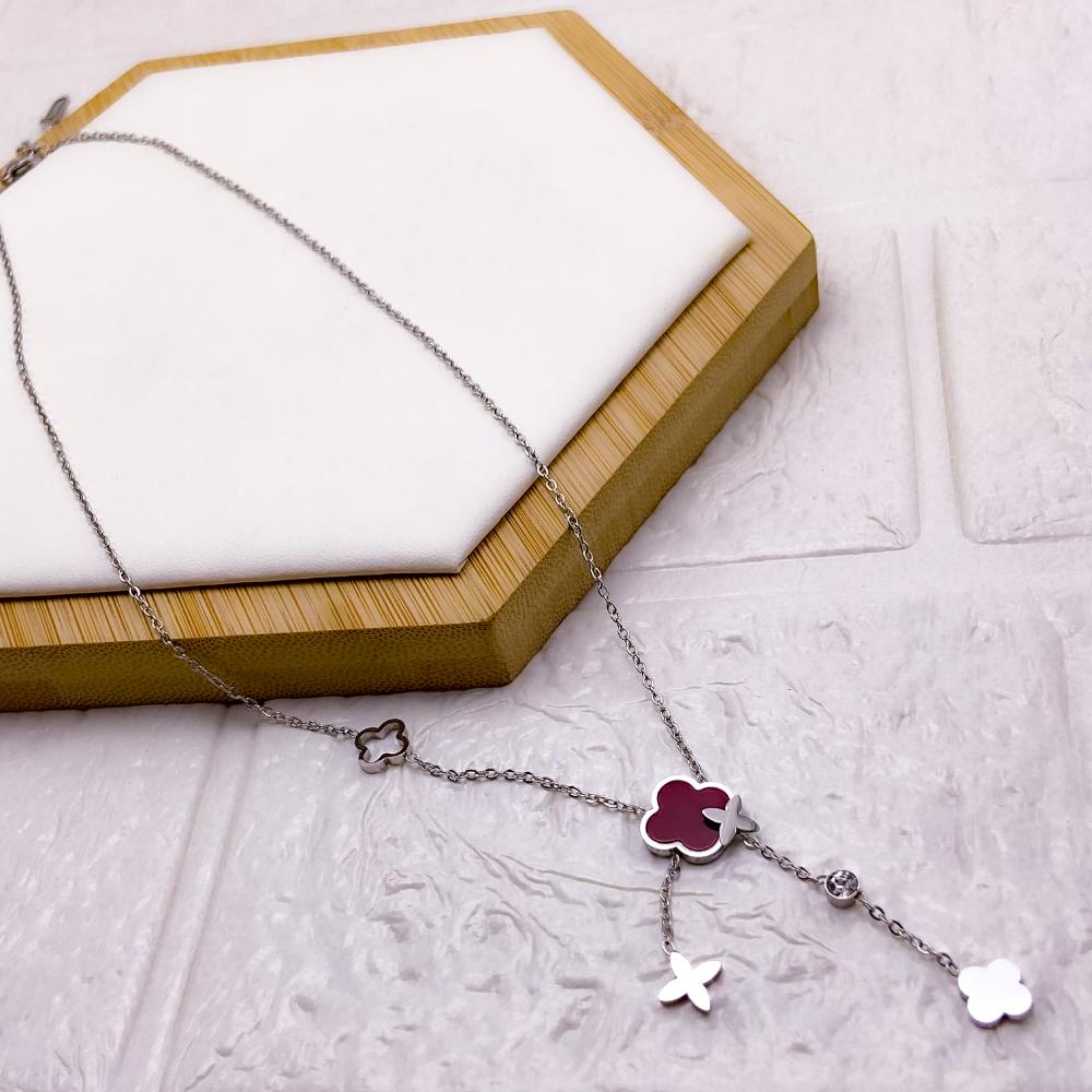 COLAR AÇO INOXIDÁVEL 45CM TREVO VERMELHO - PRATEADO