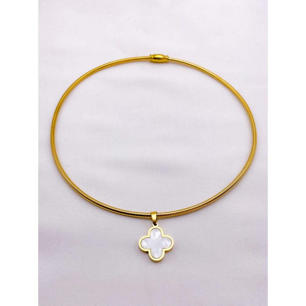 PRODUTO: COLAR AÇO INOXIDÁVEL ARO SEMI RÍGIDO PINGENTE TREVO PEROLADO - DOURADO