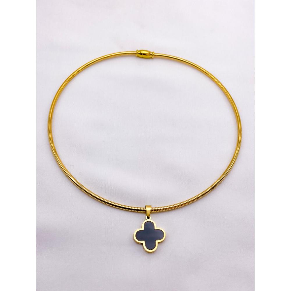 COLAR AÇO INOXIDÁVEL ARO SEMI RÍGIDO PINGENTE TREVO PRETO - DOURADO