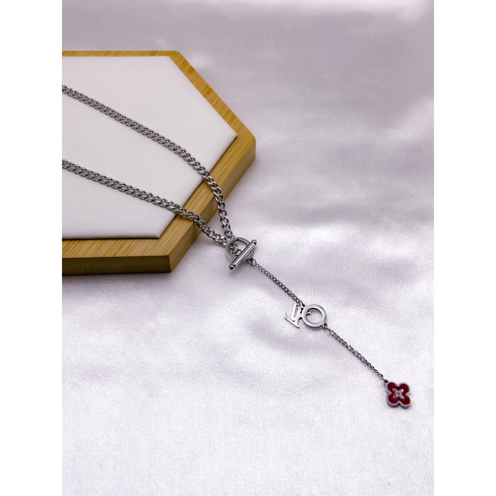PRODUTO: COLAR AÇO INOX 45CM ESTILO GRAVATINHA FECHO T TREVO VERMELHO - PRATEADO