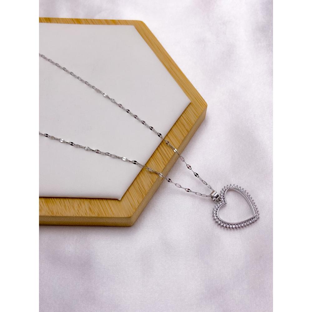 COLAR AÇO INOX 45CM PINGENTE CORAÇÃO CRAVEJADO BANHADO - PRATEADO