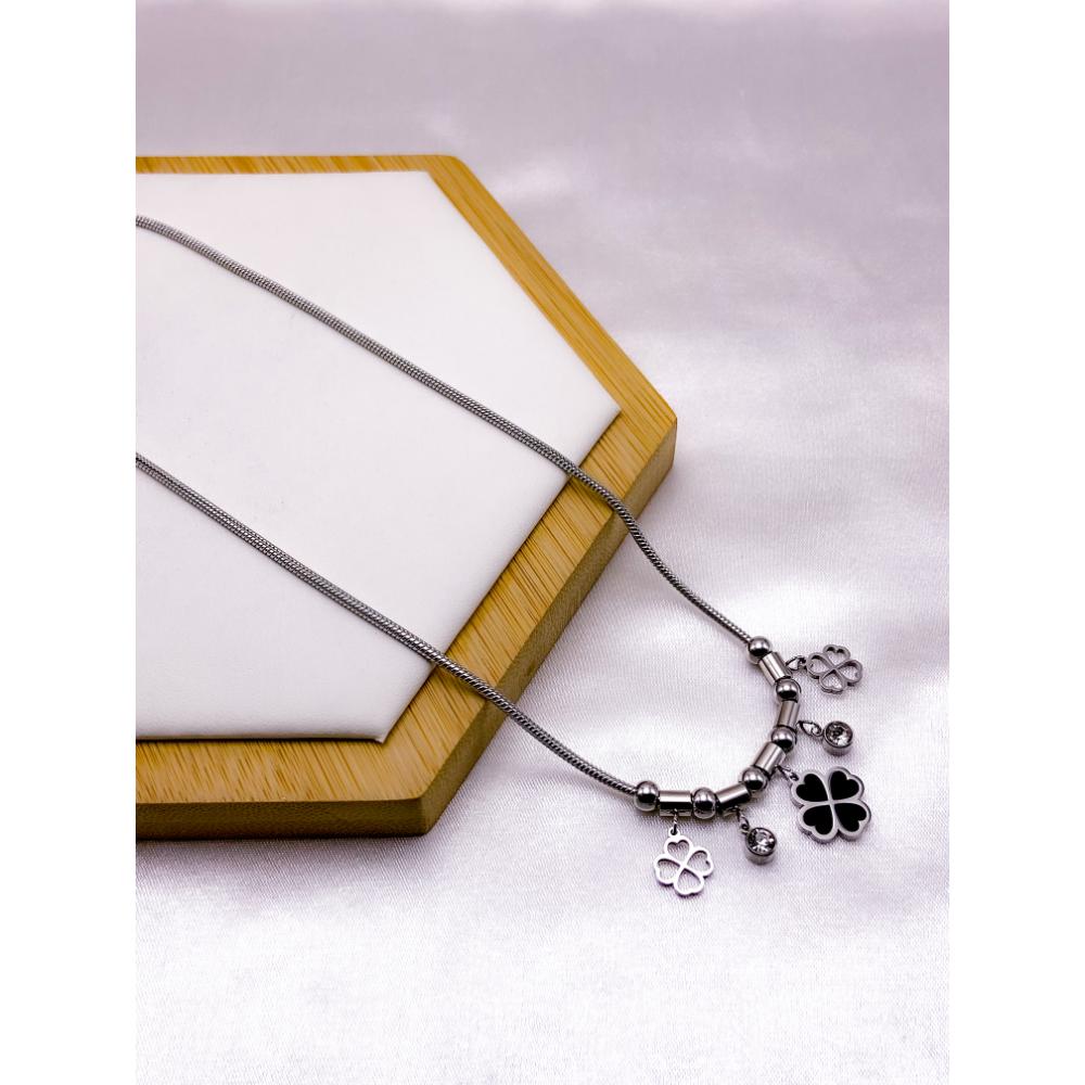 COLAR AÇO INOX 45CM PINGENTE TREVO PRETO - PRATEADO